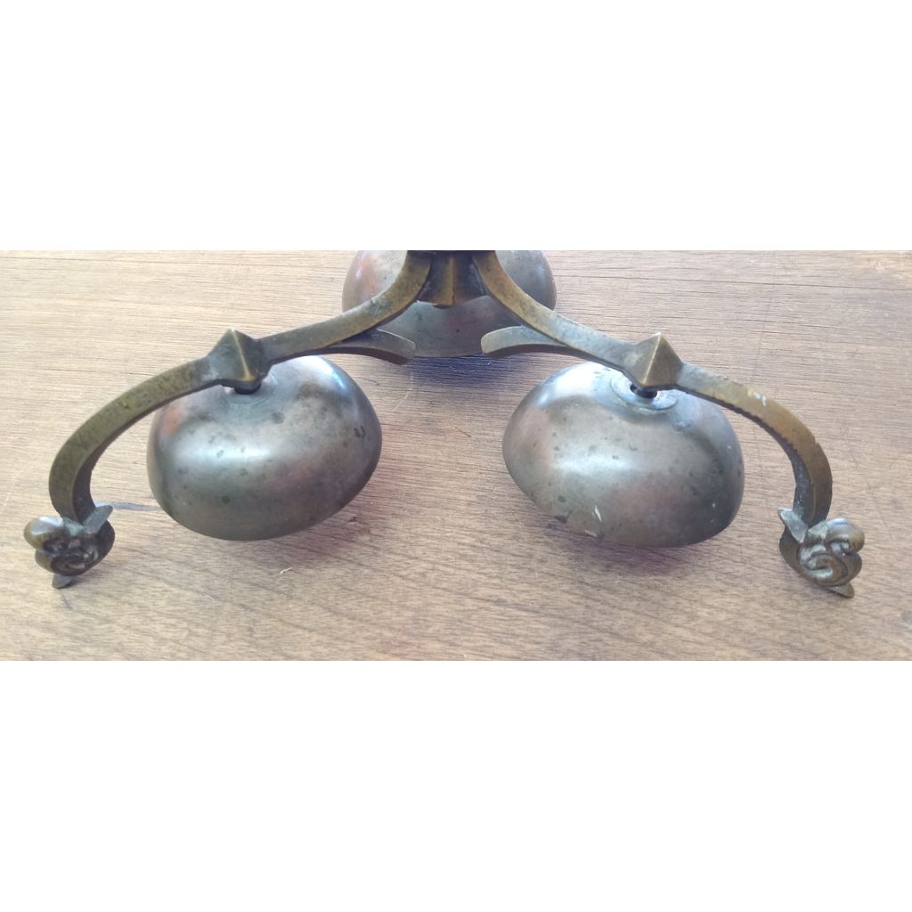 Set of antique cast brass communion bells with built in stand. Similar bells were also used for store door chimes. Each bell is a slightly different size and creates a unique sound.  The stand has a decorative handle at the top and decorative feet to allow the bells to sit . The bells are affixed to the stand but have enough play that they can jingle when moved.  The communion bells measure 7″w x 5″h. There is a fairly even patina over most of the surface. Two of the bell ringers have been replaced( one with a nut and another with a washer) but the sound produced is quite nice.