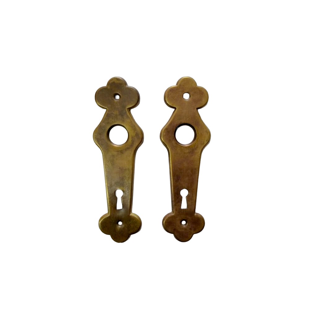 Colonial style door face plate with rounded, almost floral shaping at the top and bottom and a flared area around the doorknob. “Lenox” design made by Clinton Lock. It is made of wrought brass. Cir. 1920. The door plate measures 6 1/4″ h x 2″w. The door plate has a nice patina. There are a few small scratches near the keyhole.