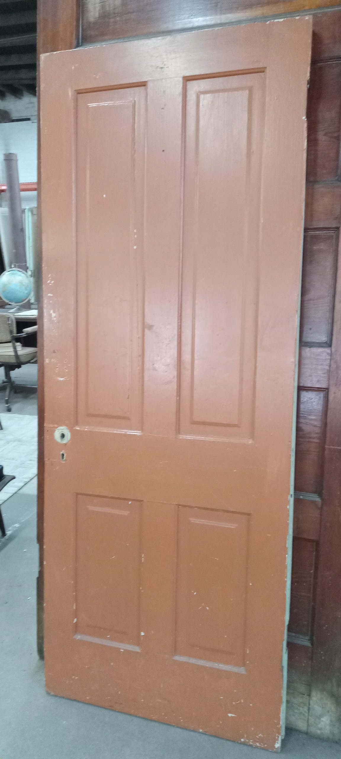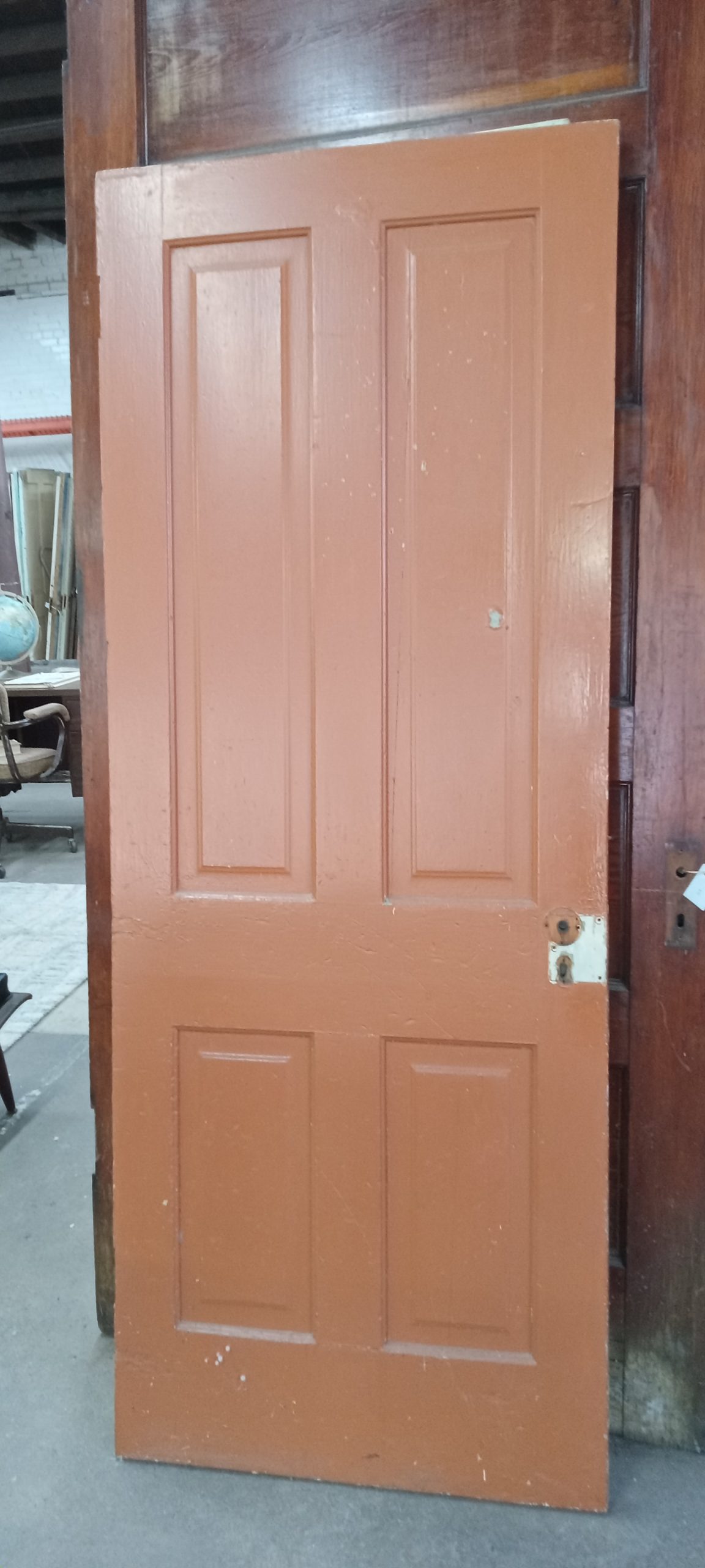 The door measures 29 3/8″w x 76 1/2″h. 4 panel door painted orange on both sides. It has rim lock (external mount) style hardware holes. It has a very thin possible crack in one of the panels.