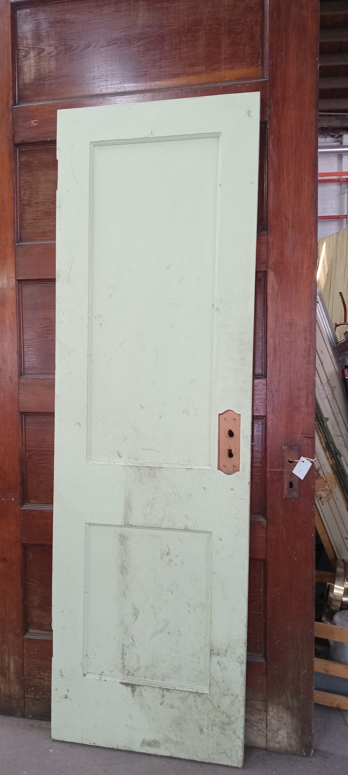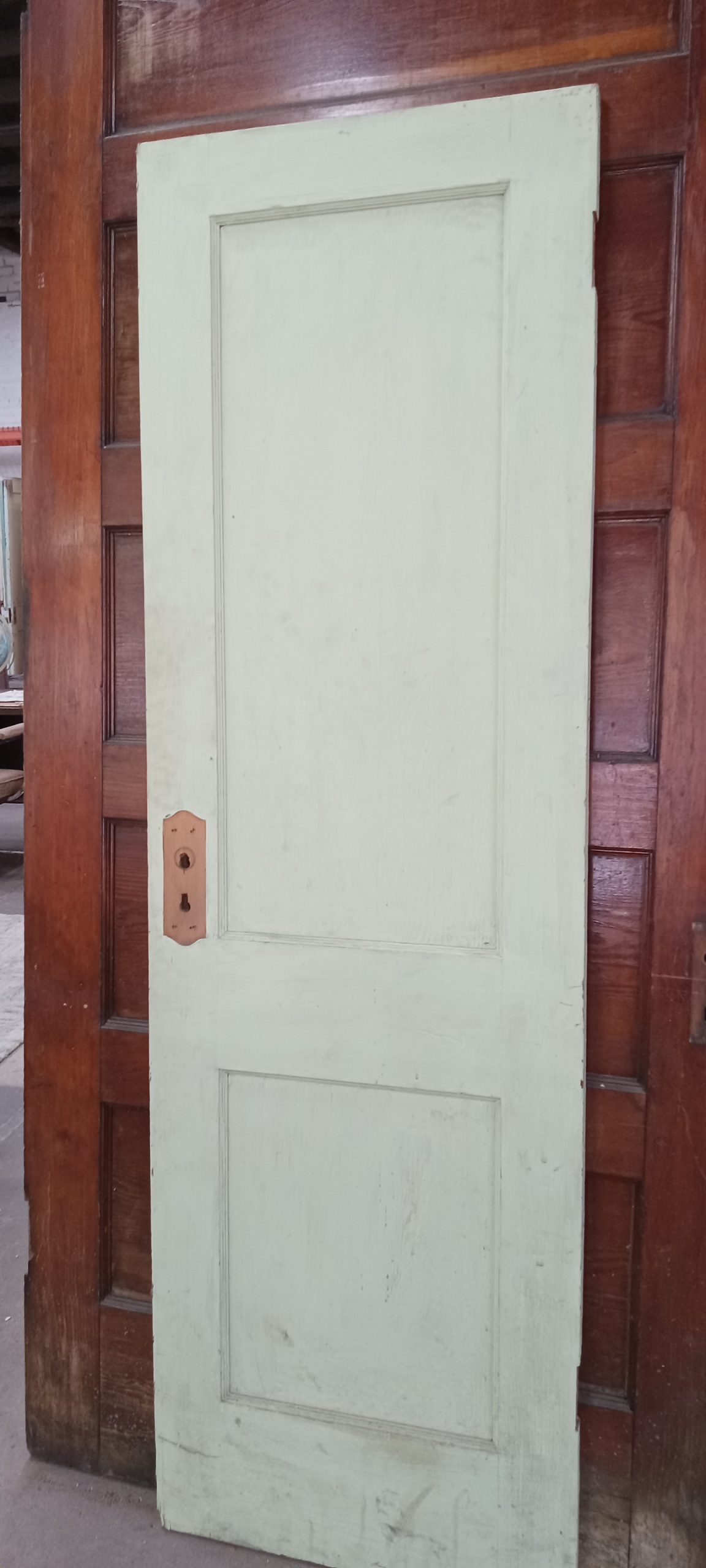 Measures 24″w x 76 1/2″h. 1 panel door painted light mint green on both sides. The door has mortise style hardware holes.