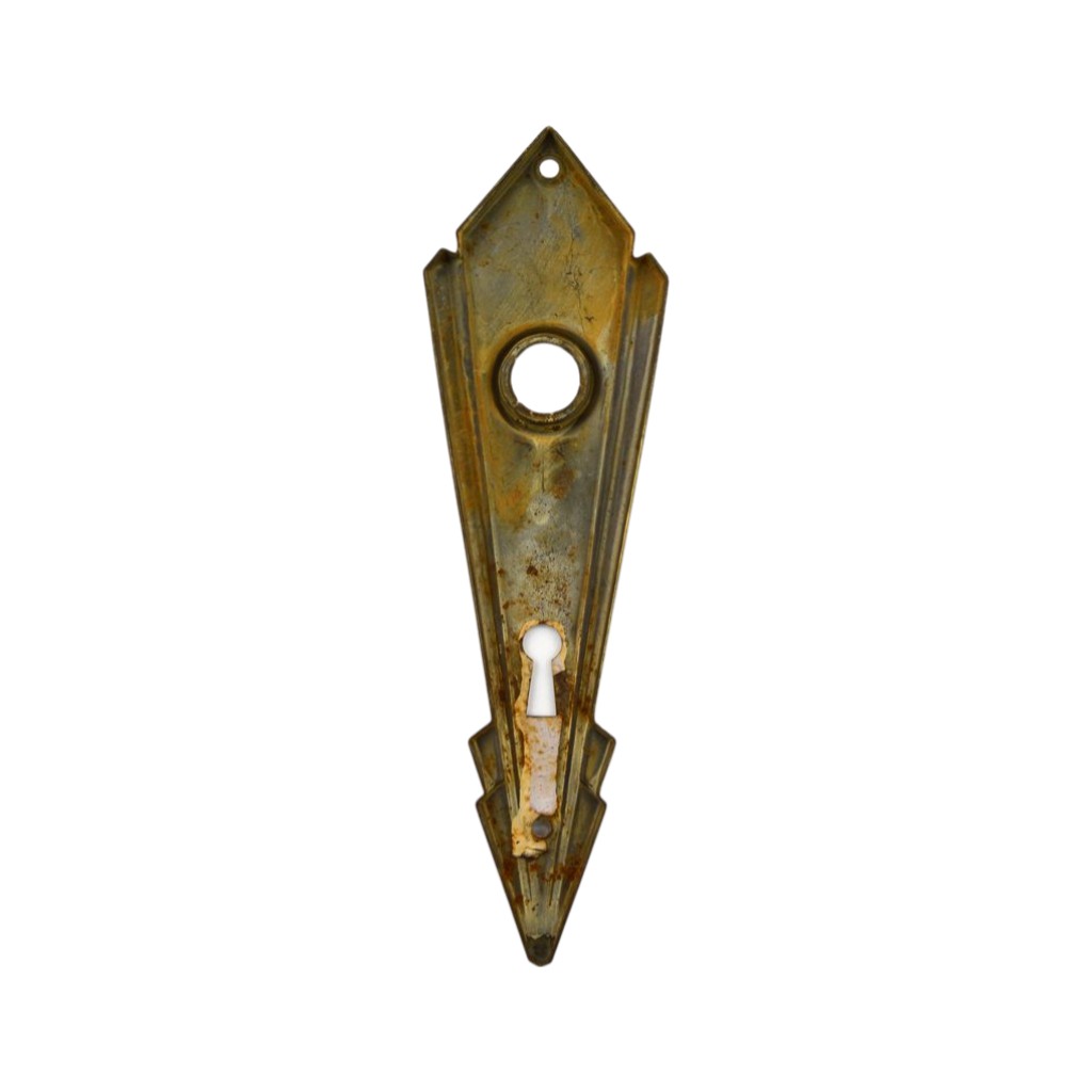 Art Deco style door face plate. Made of wrought steel with a brass finish. Cir. 1930s. The door plate measures 7″h x 2″w. Some rust spotting and finish loss around the doorknob area where a hand would rub.