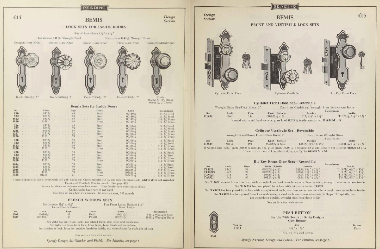 Reading Hardware began in 1872 in Reading, Pennsylvania. It produced both basic and highly decorative builders hardware. Reading’s hardware was used in many notable buildings including the White House in Washington, D.C. The operation closed in 1950.
