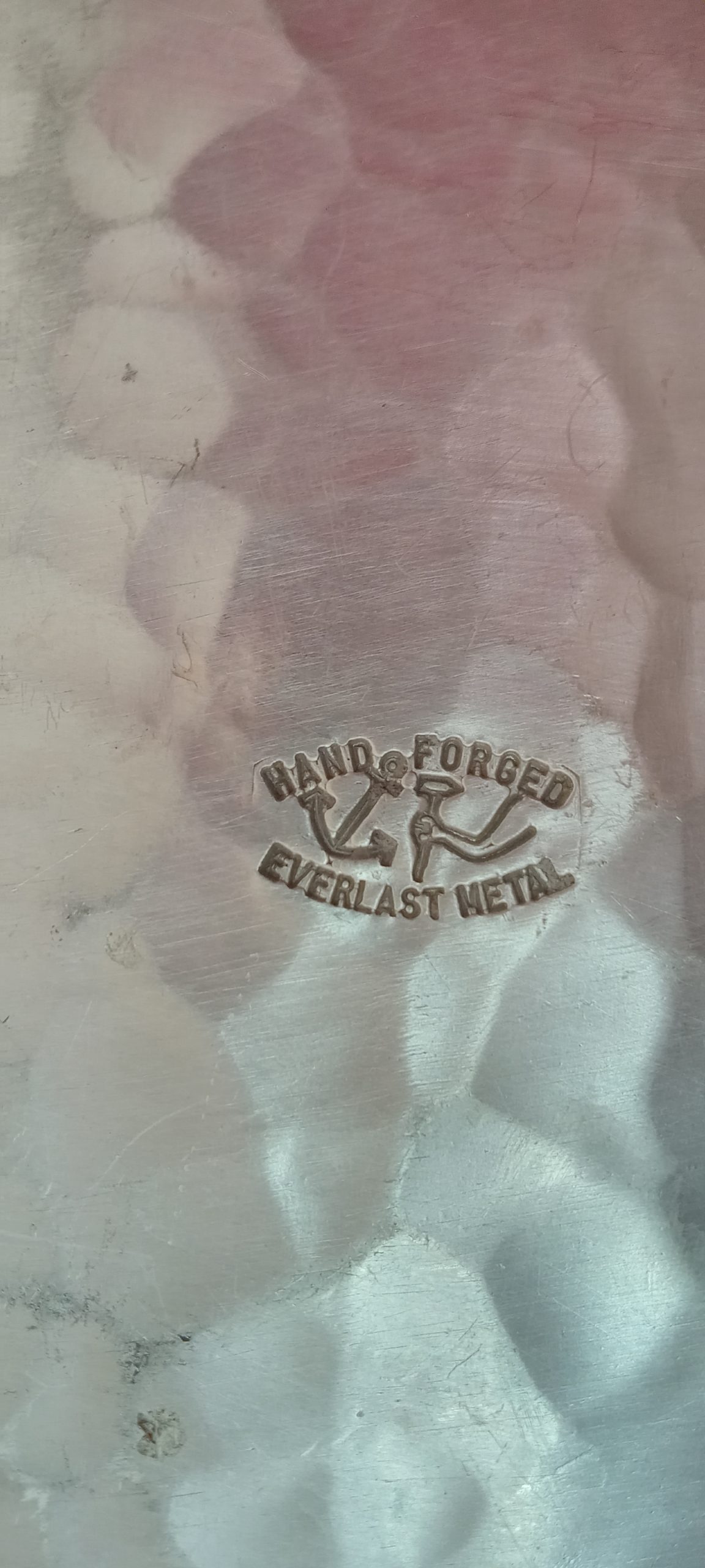 Vintage hand forged aluminum crumb tray and scraper made by Everlast. The set features flying ducks on both pieces and decorative hand hammering along the edge. The tray measures 8 3/4″w x 5 3/4″h. The crumb scraper measures 6 3/4″w x 2 3/4″h and is shaped to sit nicely inside the tray for storage. Both pieces are marked on the back Hand Forged Everlast Metal.