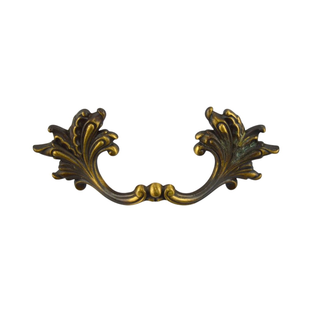 Oiled brass handle in a French Provincial style. The ends feature stylized vines and leaves. The handle measures 4 1/2″l x 1 3/4″h. It has a 3″ center to center distance for the mounting screws. The handle is marked on the back with R.D.C.A. 1960 Pat. D189084.
