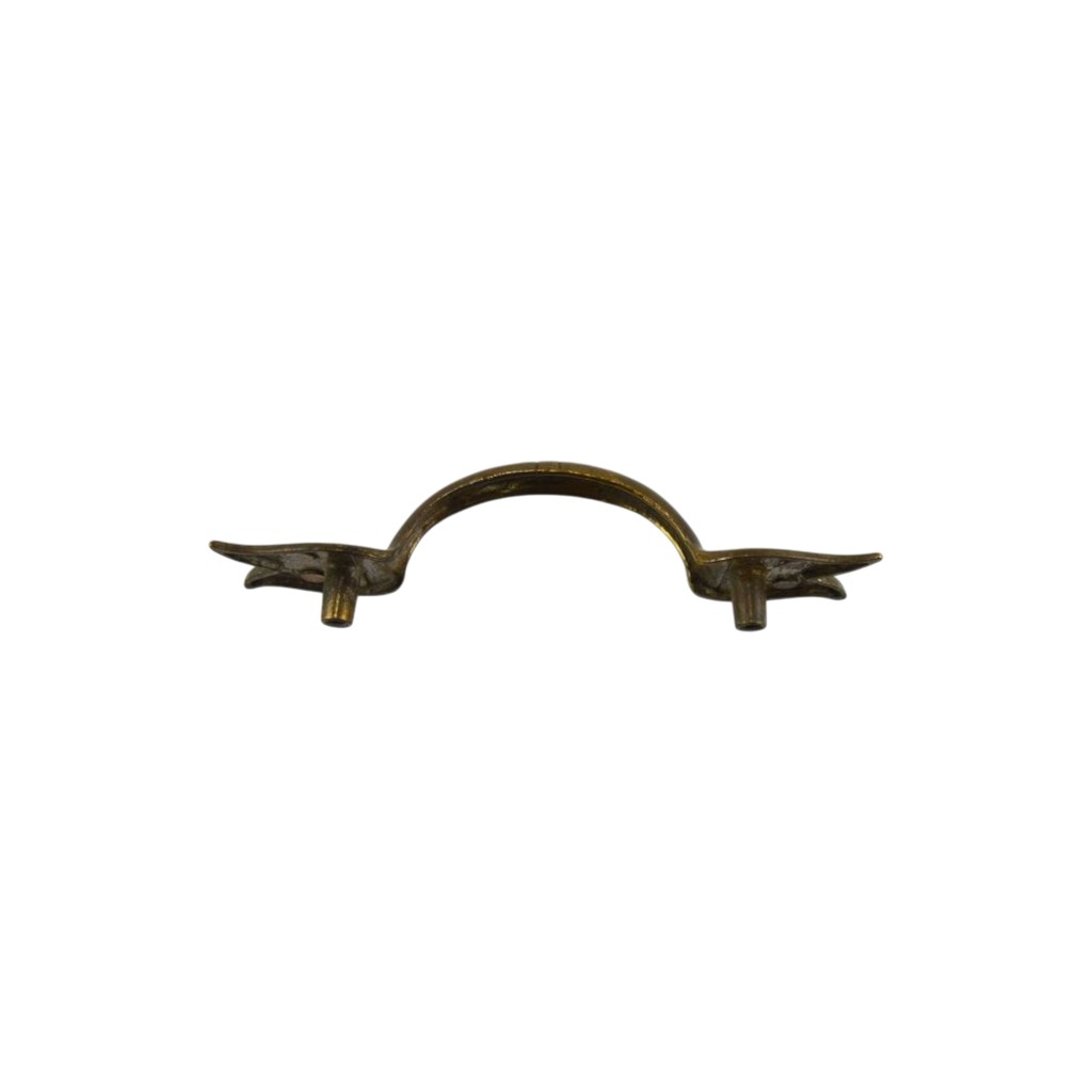 Brass bar style handle with unique tulip shaped ends. Made by Keeler Brass Company. Mission styling. The handle measures 4 3/4″l x 1″w. It has a 3″ center to center distance for the mounting screws. The handle is marked on the bottom Copyright Keeler Brass Co. N7536.