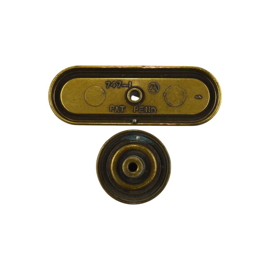 Two part knob with backplate made by Amerock.  Oiled brass oval backplate with a textured middle section. A round knob with a concentric design mounts to the middle of the decorative plate. The plate measures 3 1/8″l x 1 1/8″w.  It is marked on the back with the Amerock logo and 747-1 Pat Pend. The knob measures1 1/4″diam.