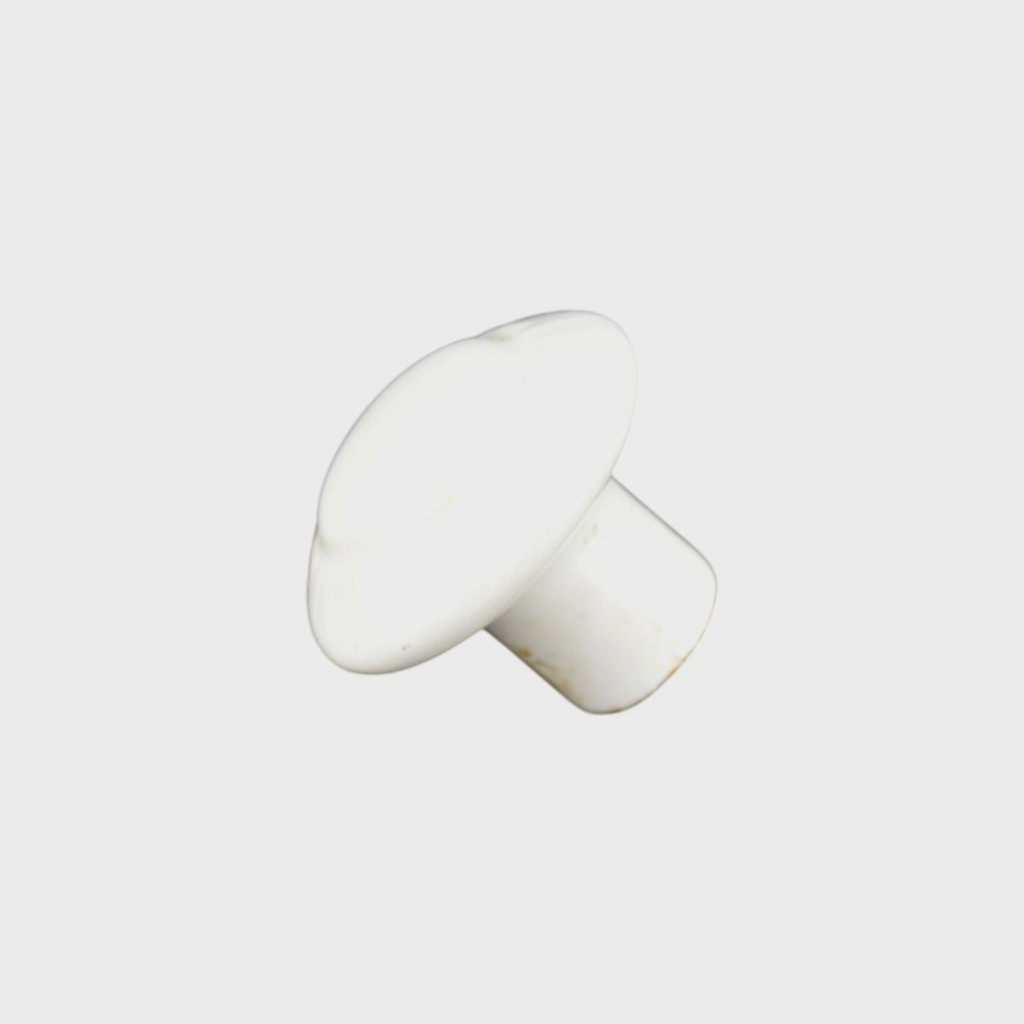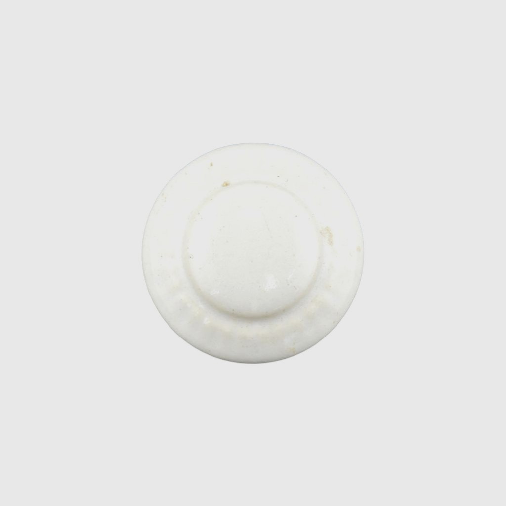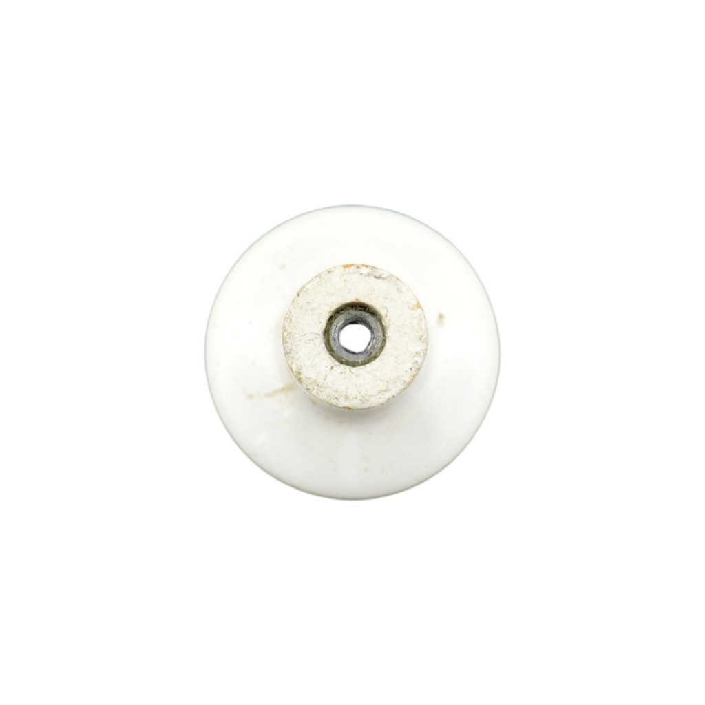 Round white porcelain knob with incised decoration on the top. The knob measures 1 1/4″diam. and sits about 1 1/8″h. Simple and elegant.