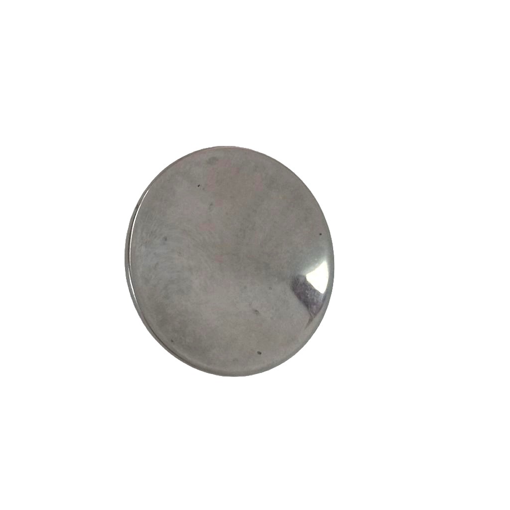 Round chrome knob with a tapered neck. The knob has a convex top. It measures 1 1/2″diam at the top, 3/4″diam at the base. No manufacturers markings. The chrome is a bit dulled from surface scratching.