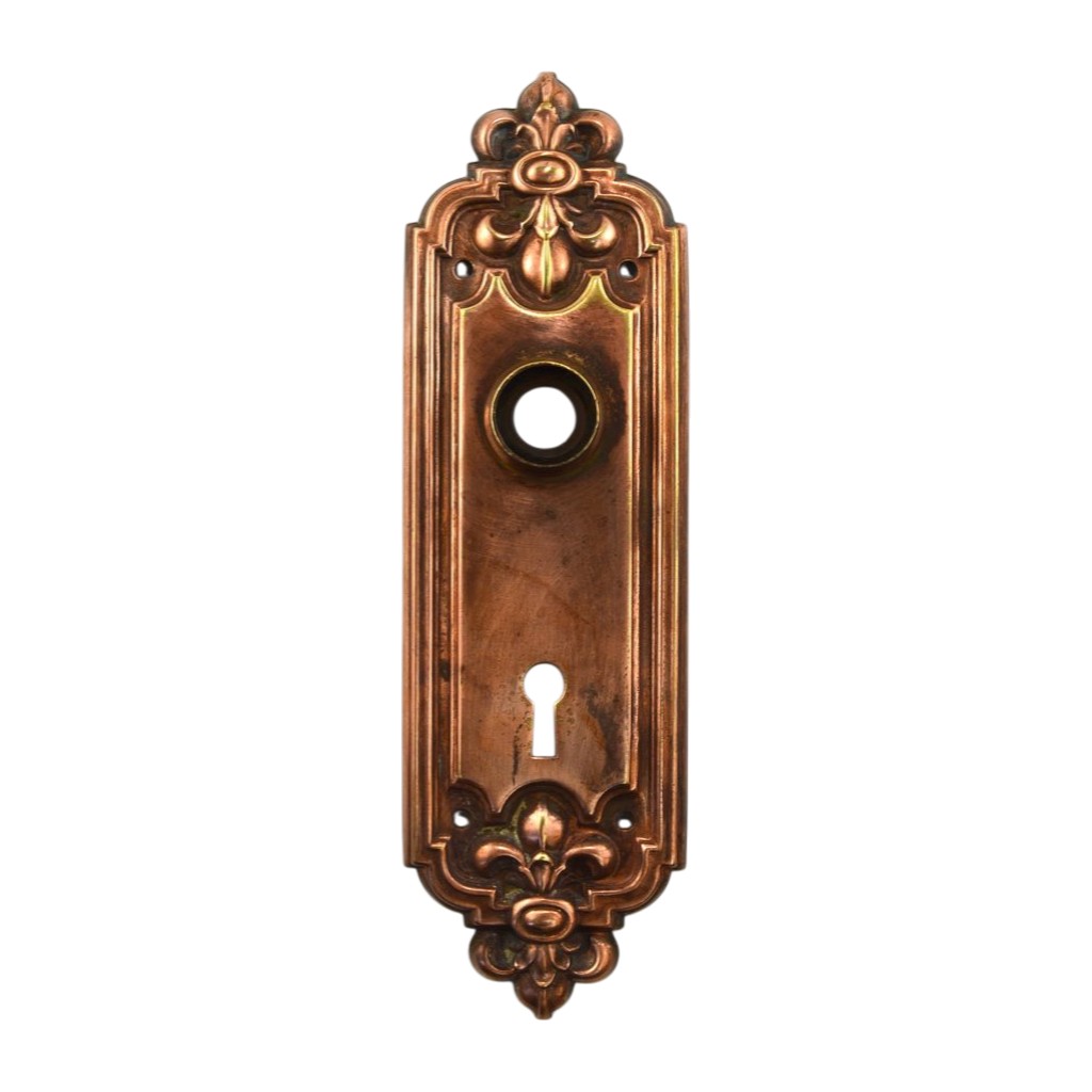 Decorative door plate by Russell and Erwin. LeRoy design. Cir. 1909. It features a fleur de lis at top and bottom and is nicely shaped. Made of bronze with a copper finish or plating. The plate measures 8″h x 2 3/8″w. Minimal patina, There is a bit of copper finish/plating loss revealing a brassier color underneath.