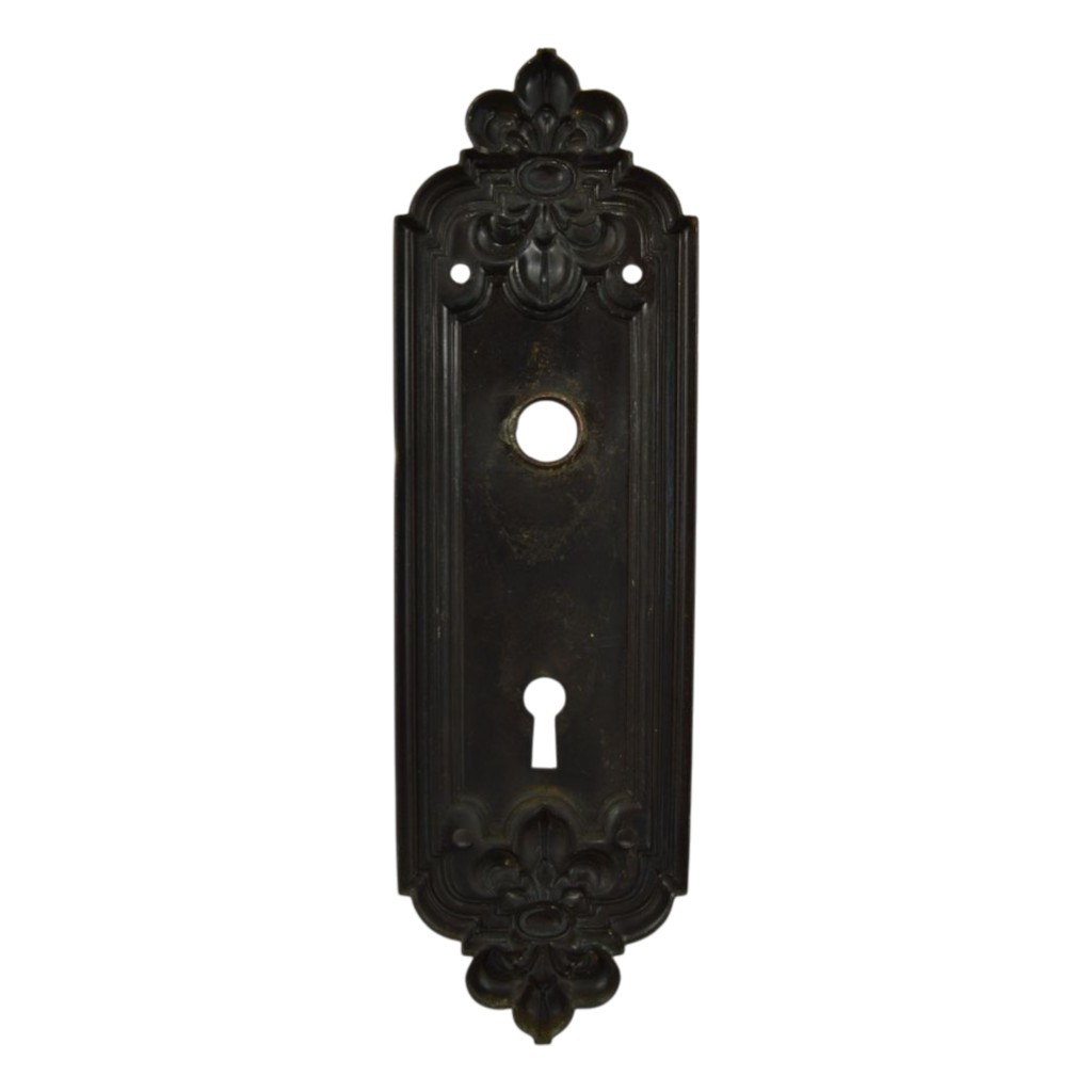 Decorative door plate by Russell and Erwin. LeRoy design. Cir. 1909. It features a fleur de lis at top and bottom and is nicely shaped. Steel with a flashed copper finish. There is some rust spotting/scratching. The plate measures 8″h x 2 3/8″w.