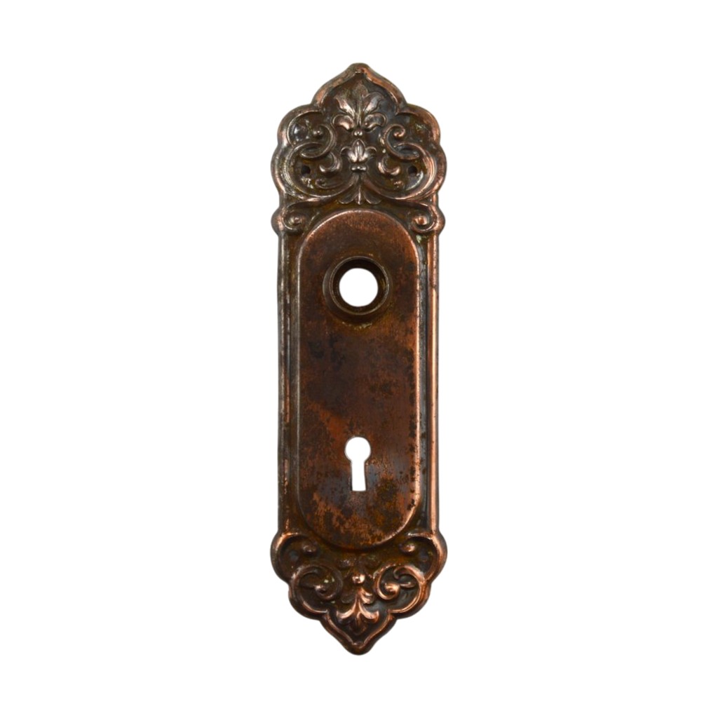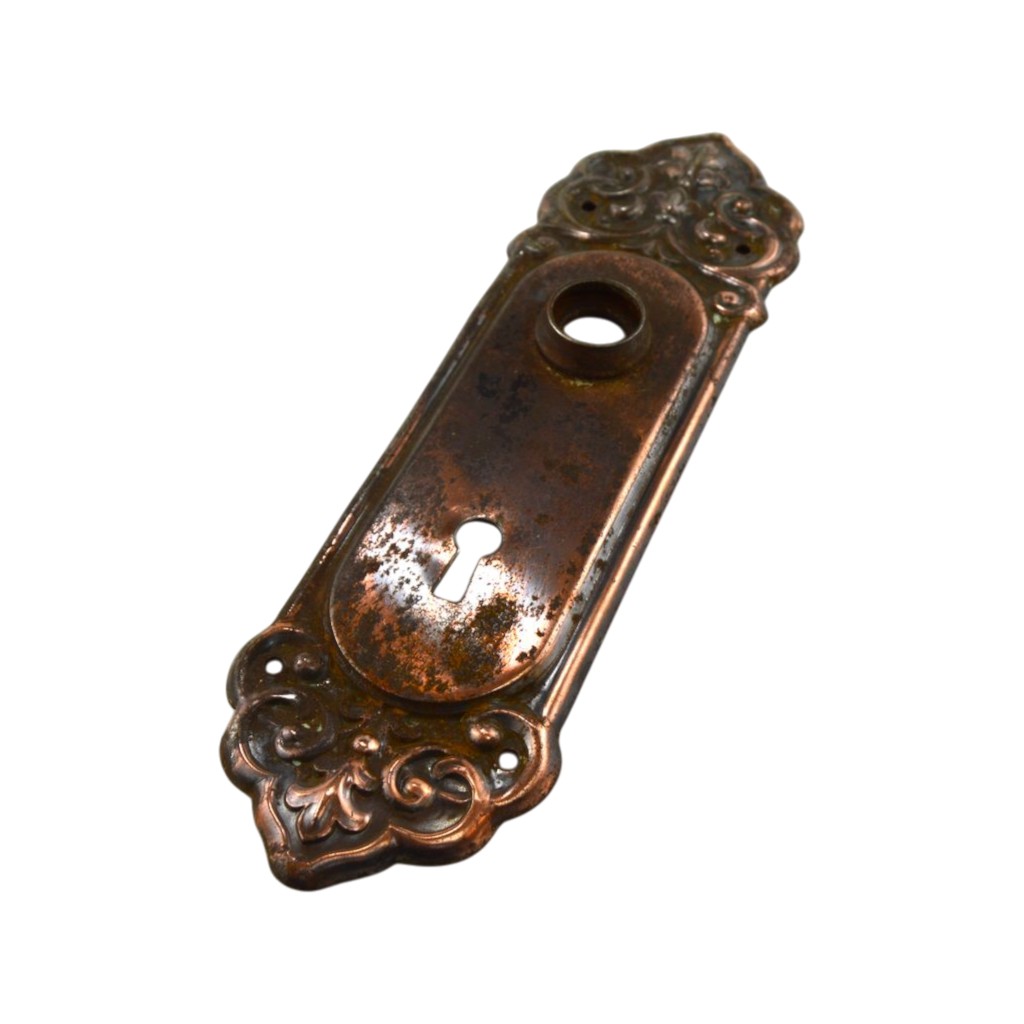 Wrought steel decorative door plate with flashed copper plating. Made by Lockwood. Saxon design. Cir 1914. The door plate is decorative and shaped on the top and bottom. It measures 8 1/4″h x 2 1/2″w. There are areas of rust residue and plating loss over much of the surface, but a good amount of the color remains.