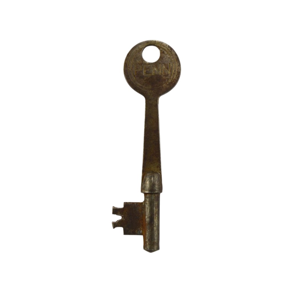 Skeleton key made by Penn. It is marked with the Penn logo on the top with an 11 underneath on one side. It has notches on each side near the bottom and a notch in the middle bottom of the bit. It looks like it may have been modified a bit. The key measures 2 5/8″l with the pin (insert) measuring 3/4″l. The bit is 5/8″l from the top of the pin.