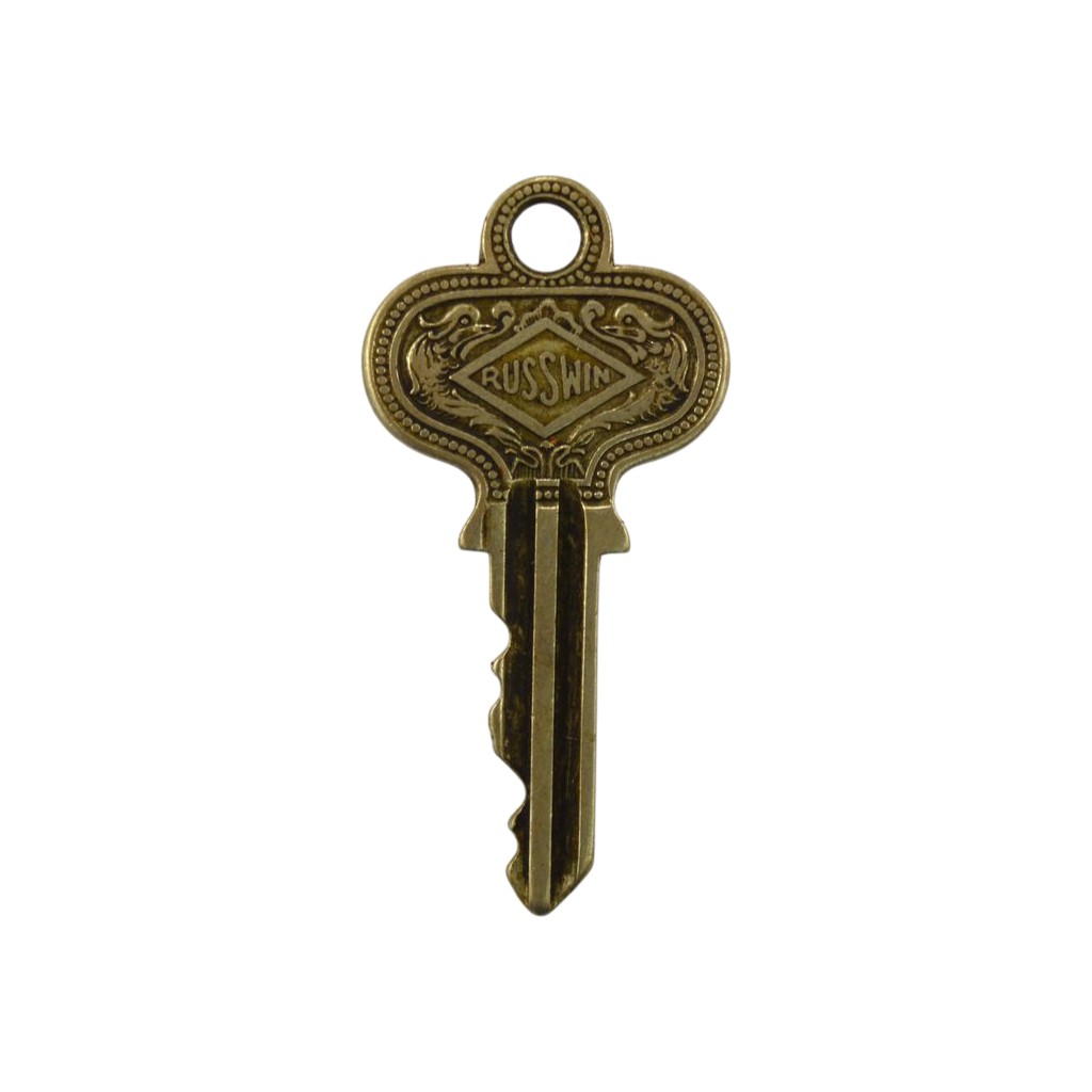 Cylinder key made by Russell and Erwin for use with doors. Marked with RE Co. logo on the top on one side and Russwin on the reverse. The top has decorative scrollwork on both sides. The bit is marked 721054. The key measures 2 1/4″l with a 1″l bit.