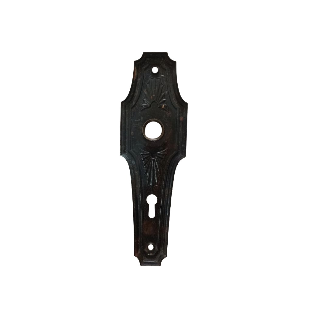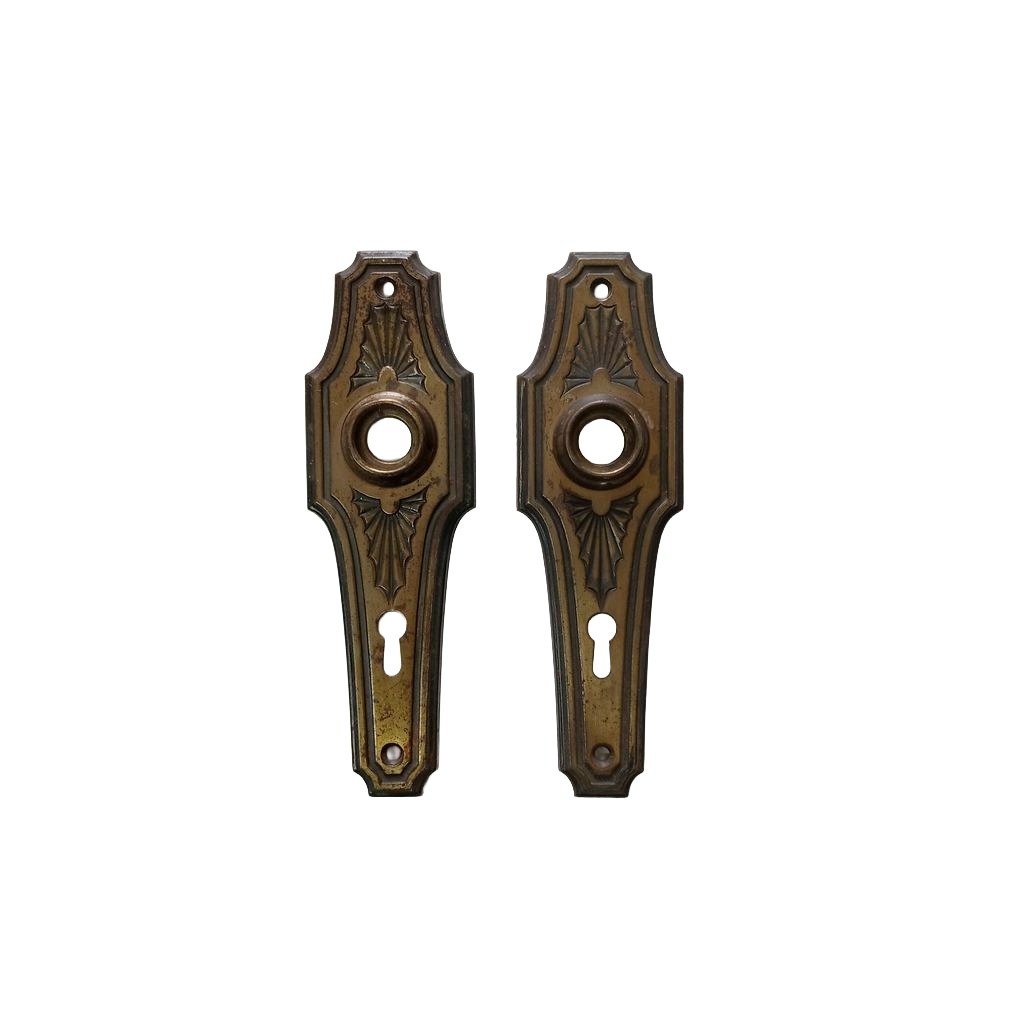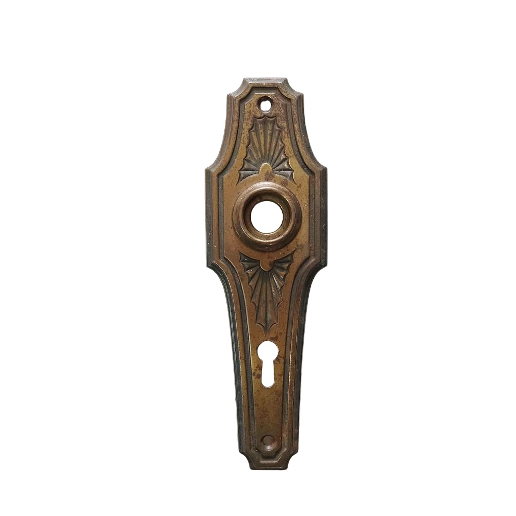 Art deco style door plate made by Russell and Erwin. Juno design. Cir. 1930. The door plate is shaped with a sunburst design radiating from the doorknob area. The door plate is made of wrought steel with a brass finish. It measures 6 1/2″l x 2″w.