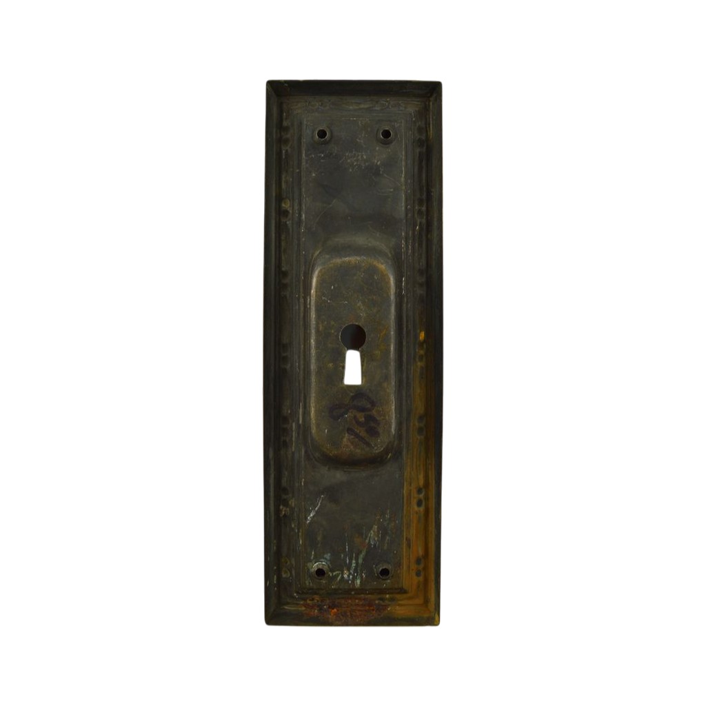 Wrought steel pocket door plate with a bronze finish made by Russell and Erwin in “Surrey” design. Cir. 1909. Flush mount style with a keyhole in the middle. The plate measures 7 7/8″h x 2 5/8″w. The inset area that would need to be cut out of the door measures 3″h x 1 1/4″w. There is some rust pitting at the bottom and some areas of finish loss.