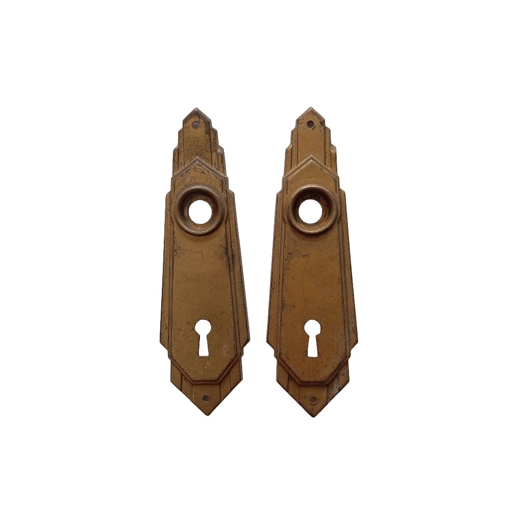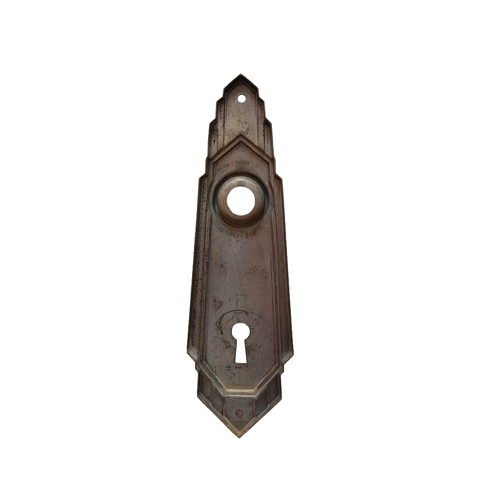 Art deco style door face plate. The door plate is made of steel with a brass finish. “Elkhart” design by Sager Lock Works. Cir. 1937. It measures 5 7/8″h x 1 3/4″w at the maximum width (it is only 1 3/8″w at the doorknob level).