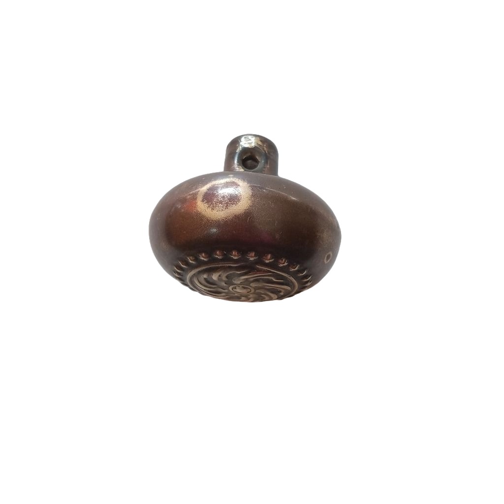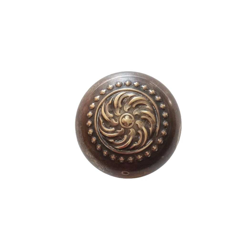 Decorative doorknob- “Clinton” design by US Steel. Cir 1907. Made of wrought brass. The knob features an intricate spiral design with a floral or cross border. The doorknob measures 2 1/4″diam. It fits on a standard non-threaded square shaft.