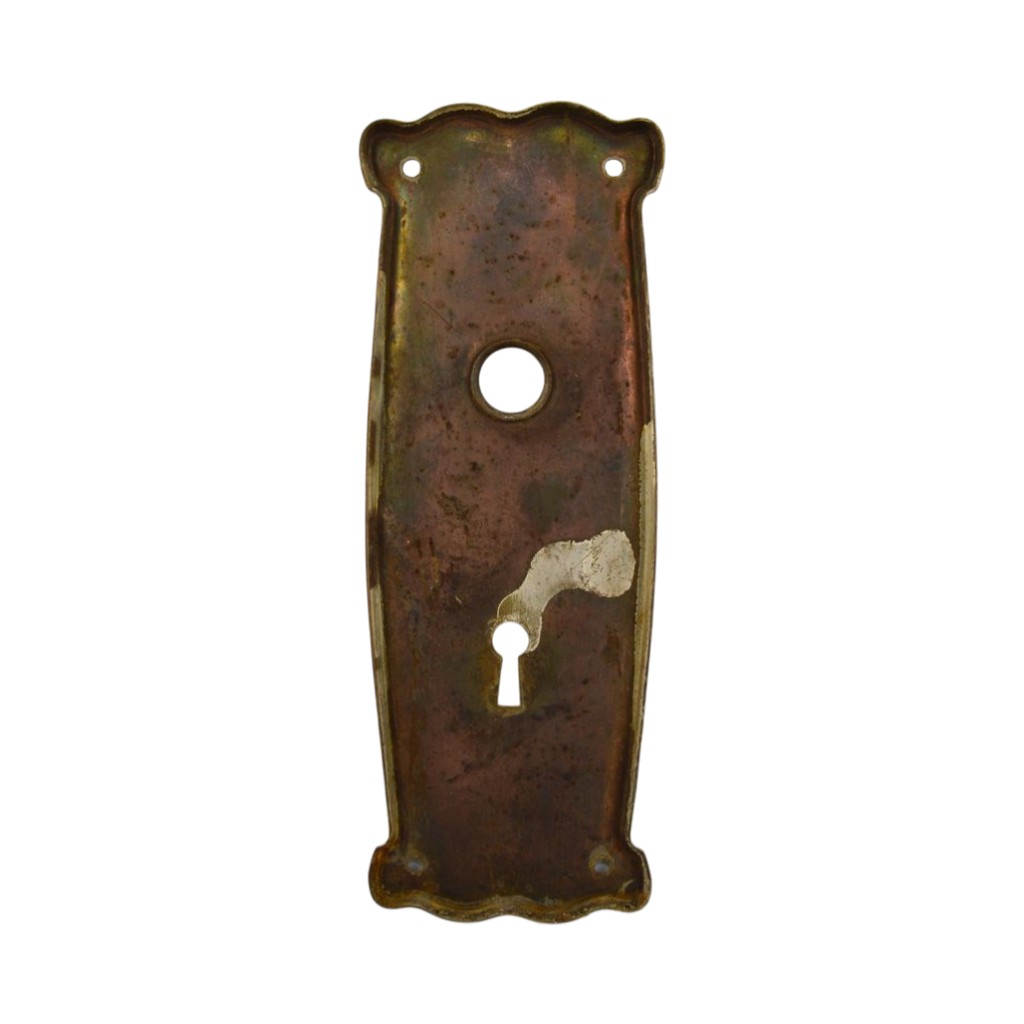 Door plate made by US Steel. Lafeyette design. Cir. 1910. The plate is made of wrought steel with a brass finish. It features shaped ends with a double bump on the top and bottom. The door plate measures 7″l x 2 3/8″w. Some rust residue and finish loss.