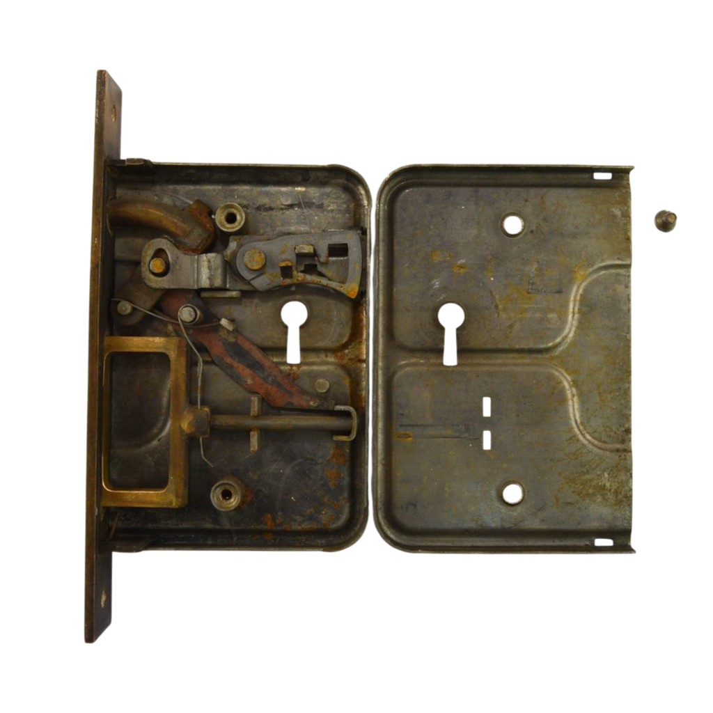 Mortise lock box for pocket doors made by US Steel. Cir. early 1900’s. A button on the top releases the handle. The face plate has a bronze finish with bronze mechanisms. The front plate measures 7 1/8″h x 7/8″w. The box measures 3 1/4″w x 5″h x 5/8″d. The box is marked US Steel Lock Co. Sole makers of The Warner Locks, Clinton, Iowa, U.S.A.