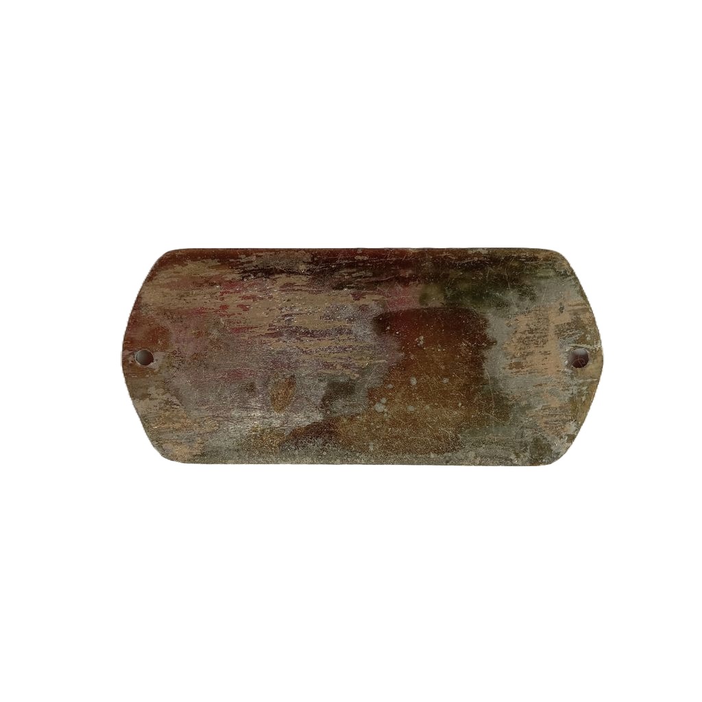 Nickel plated name label from a White Clad brand Icebox. The label tag reads “Trademark White Clad Registered Simmons Hardware Co. St. Louis, MO. U.S.A.” The text is printed on a textured background. The label has two holes for mounting. It measures 3 1/2″l x 1 1/2″h.