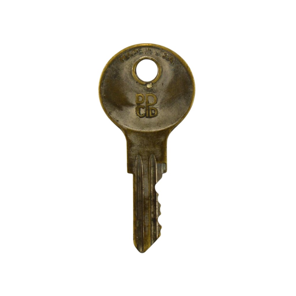 Cylinder style  key made by Yale. Marked on one side The Yale & Towne Mfg. Co. Yale Junior U355. On the reverse it is marked Made in USA, DPCD. This stands for Dodge Plymouth Chrysler DeSoto. Yale made keys for ignition, doors and gloveboxes for these cars from the 1930’s through the 1960’s. The key measures 1 13/16″l with a 5/8″l insert.